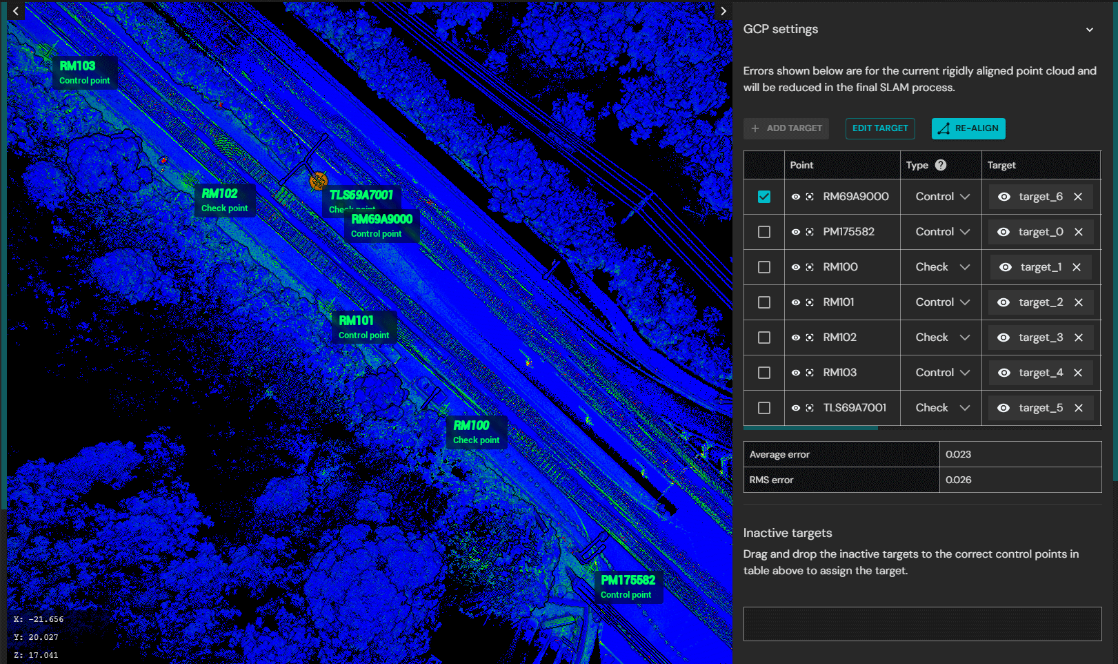 The data was then processed and uploaded to Aura, utilising the new User Selected Targets feature in the GCP workflow. Accuracy was tested against check points established with a Leica TS13 Total Station.