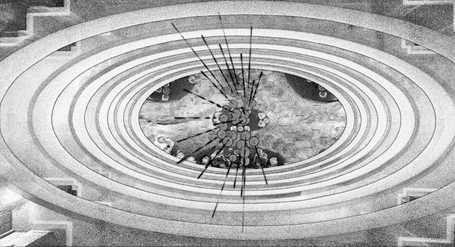 من اليسار إلى اليمين: صورة سحابية نقطية للفندق، صورة سحابية نقطية - مقطع عرضي عبر الفندق، صورة سحابية نقطية - النظر إلى الأسفل عبر الردهة