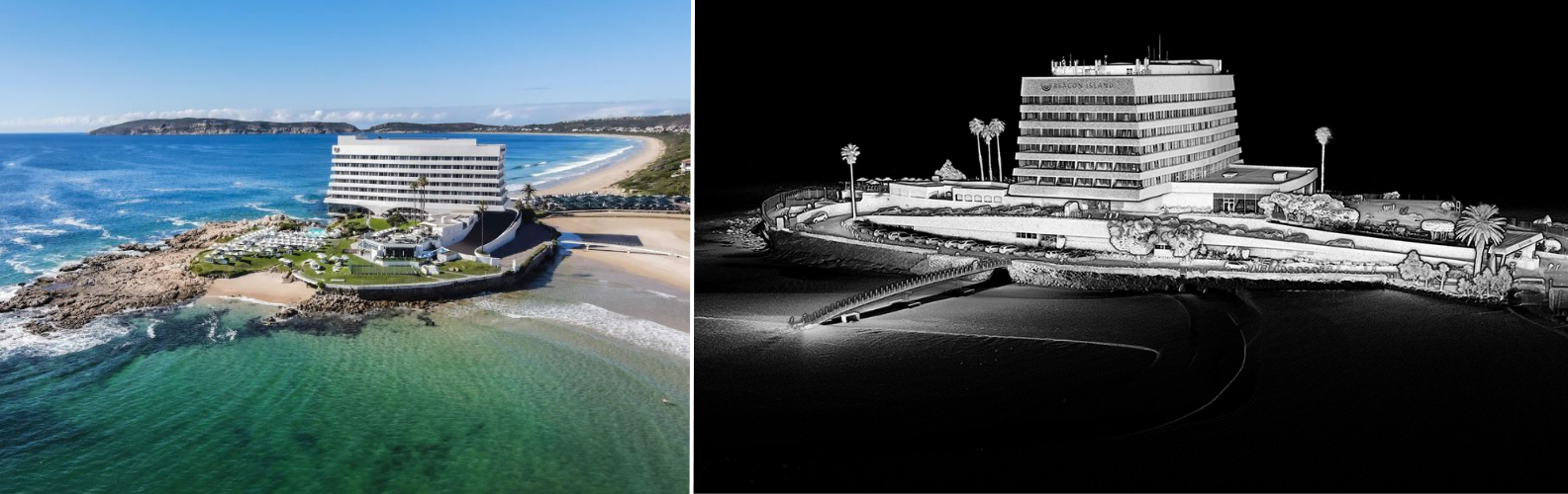 Left to right: The Beacon Isle Hotel in Plettenberg Bay, South Africa, Point cloud image of the Beacon Isle Hotel
