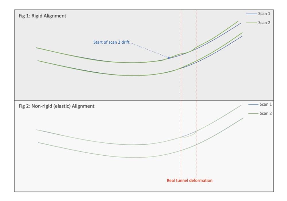 In Fig 1, a rigid alignment of Scan 1 and Scan 2 masks the true tunnel deformation and instead estimates an apparent change due to scan drift.
