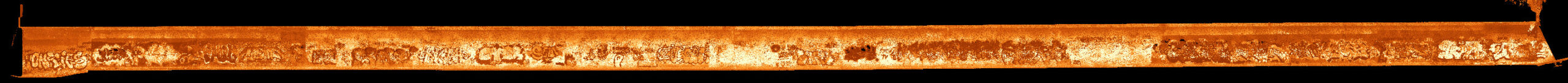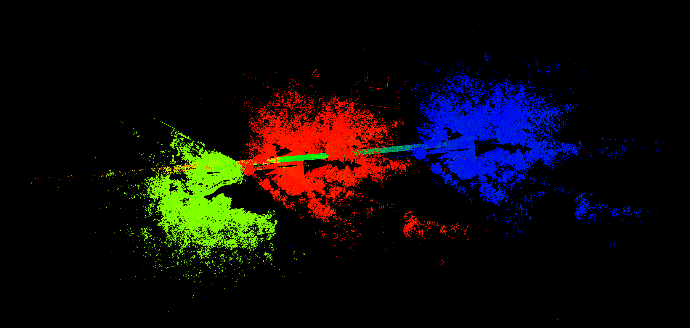 この画像はスキャンを時間ごとに色分けしたものである(青→緑→赤)。スキャンの青と赤の部分はそれぞれ開始と終了であり、一直線上に並ぶはずである。