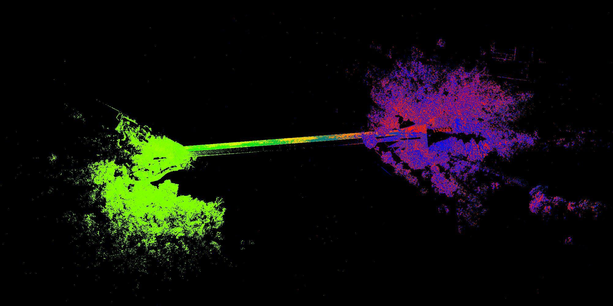 2回目のスキャンでは、バックパックに装着されていたため視野が制限され、さらに後続者のネガティブな特徴が加わった結果、デフォルトの設定ではスリップせずに処理されなかった。スキャンを時間ごとに色分けすると、SLAM スリップが発生したタイミングが強調される。この3色画像では、スキャンは暗渠の右側から始まり、暗渠を通って再び戻ってきた。復路では、SLAM 、かなり劇的にスリップしており、その結果、スキャンの終わりと始まりが一致していない。