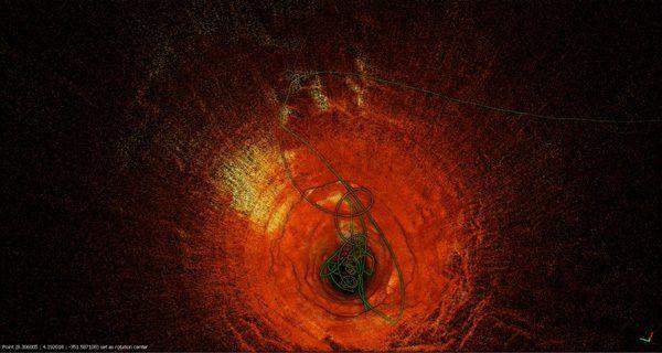 A mina Northparkes block cave da CMOC é reconhecida como uma das operações mais automatizadas do mundo. A expansão subterrânea planeada exigia novos alteamentos de entrada e saída de ar, que falharam nas secções inferiores pouco depois de a perfuração ter sido concluída. A CMOC necessitava de dados exactos sobre o estado dos alteamentos para poder desenvolver planos de remediação ou de contingência. Hovermap montado numa gaiola foi baixado 560 m pelo poço de entrada, captando dados geotécnicos detalhados da deformação e da rutura excessiva.