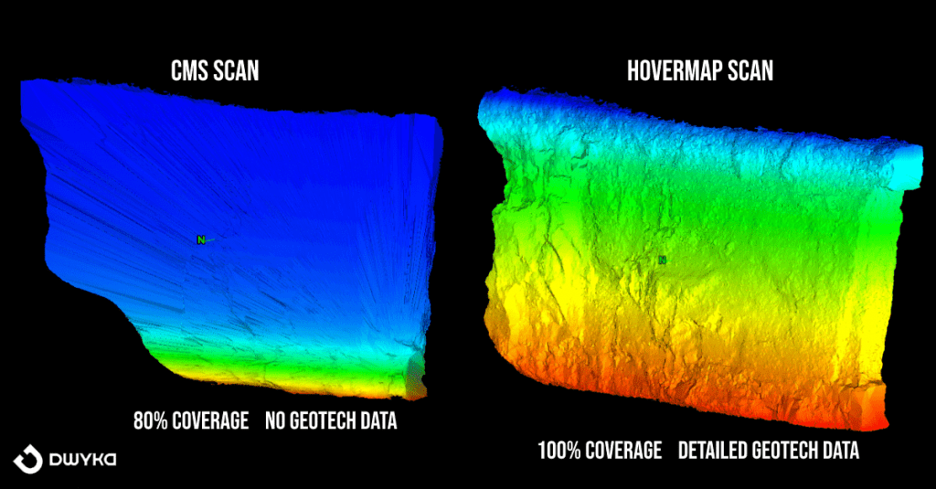 下图展示了同一采场区域的CMS扫描与Hovermap 。Hovermap 质量卓越,覆盖率近100%,并提供了详尽的地质技术信息。相比之下,传统吊臂式CMS扫描覆盖率最高仅达80%,且需测量员通过调整三角测量法估算体积。Hovermap矿山测量团队可直接从数据中获取精确体积,团队成员认为"其性能比吊臂扫描仪优越百倍"。